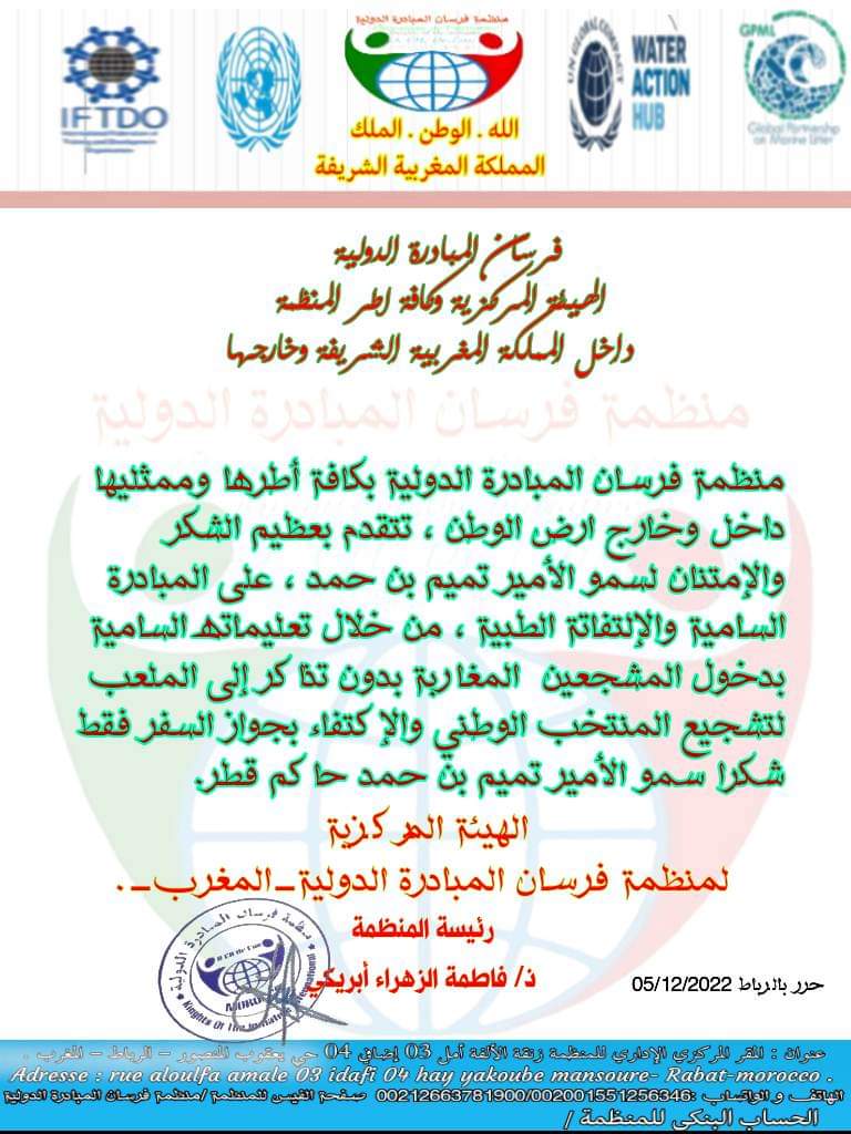 رسالة شكر لسمو الأمير تميم بن حمد 5 ديسمبر، 2022 مؤسسة محمد السادس للسلام والتسامح 928 زيارة الشاملة بريس- فرسان المبادرة الدولية شاركها Facebook Twitter LinkedIn Pinterest