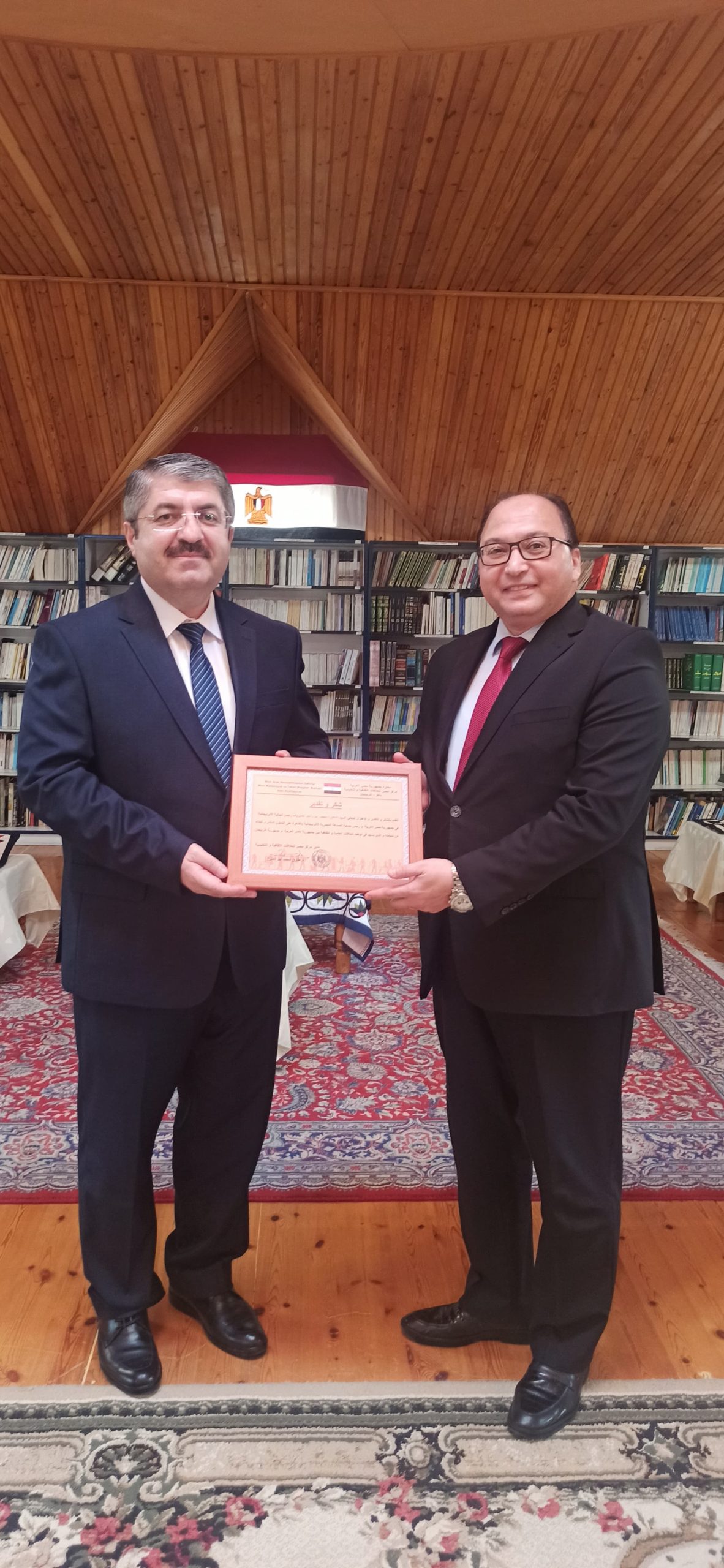 في إطار تعزيز العلاقات الثقافية والعلمية بين جمهورية مصر العربية وجمهورية أذربيجان، قدّم الأستاذ الدكتور طارق أبو الفتوح، مدير مركز مصر للعلاقات الثقافية والتعليمية في باكو، ميدالية وزارة التعليم العالي والبحث العلمي المصرية وشهادة شكر وتقدير إلى الدكتور سيمور نصيروف، رئيس الجالية الأذربيجانية في مصر، وذلك خلال زيارته إلى مركز مصر للعلاقات الثقافية والتعليمية بالعاصمة الأذربيجانية.