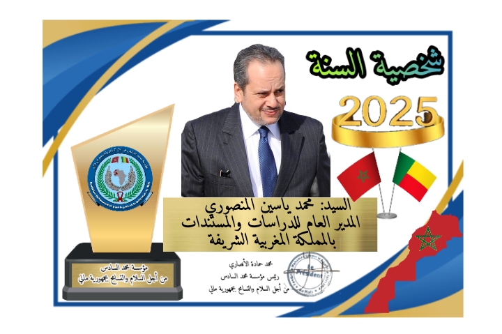 سيرا علي نهجها وفي إطار ثقافة الاعتراف إختارت مؤسسة مؤسسة محمد السادس من أجل السلام والتسامح بجمهورية مالي معالي السيد محمد السيد ياسين المنصوري المدير العام للدراسات والمستندات ضمن الشخصيات الوطنية لسنة 2025 .