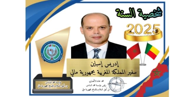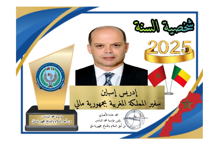 دائما وفي إطار ثقافة الإعتراف التي تنهجها مؤسسة محمد السادس من السلام والتسامح بجمهورية مالي كل سنة قرر المكتب التنفيذي للمؤسسة منح شخصية السنة 2025 لمعالي السيد إدريس إسباين سفير صاحب الجلالة بجمهورية مالي ومنذ أن حظي بالثقة المولوية الملكية السامية وهو يشتغل ليل نهار خدمة للقضايا العادلة المشتركة والعلاقات التاريخية المتينة بين المملكة المغربية الشريفة وجمهورية مالي تماشيا مع توجيهات مولانا أمير المؤمنين صاحب الجلالة الملك محمد السادس نصره الله وأيده ، وفخامة الرئيس المالي الإنتقالي آسيمي غويتا