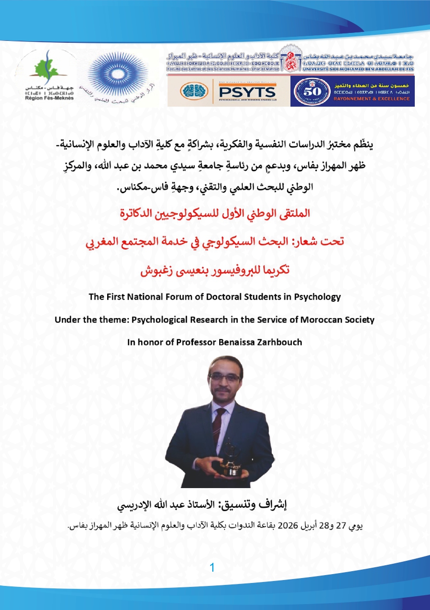 تنعقد هذه التظاهرة العلمية الوطنية التي يشرف على تنسيق أشغالها الدكتور عبد الله الإدريسي (أستاذ علم النفس بجامعة سيدي محمد بن عبد الله) يومي 27 و28 أبريل 2026 بقاعة الندوات بكلية الآداب والعلوم الإنسانية ظهر المهراز بفاس، حيث سيقدم الطلبة الدكاترة أعمالهم العلمية وستتم مناقشتها من قبل أساتذة باحثين مختصين. كما ستتخلل هذه الدورة ورشة علمية خاصة بآليات النشر العلمي في المجلات المفهرسة.